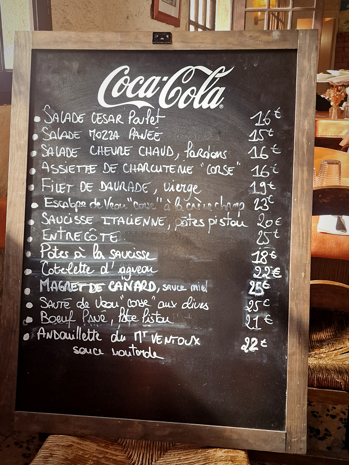 De long en large et en travers, la lecture de l’ardoise creuse la dalle : assiette de charcuteries corses, pâtes à la saucisse, filet de daurade sauce vierge, entrecôte à la braise, magret de canard sauce au miel, saucisse italienne tranchée et nappée de sauce pistou. A vous d’accompagner ça de frites, de polenta crémeuse, de pâtes aux champignons. Le sauté de veau corse n’a rien à voir avec une financière car, bien qu’agrémenté d’olives vertes et champignons, sa sauce est tomatée à l’envi, servie bouillante sur une polenta crémeuse et parsemée d’herbes aromatiques. Mousse chocolat, tiramisu, crème brûlée ou caramel, tout est fait sur place (comme le reste). La crème caramel baigne dans le caramel ; dans le café servi bien chaud, on trempe de la chantilly, ça fait un deuxième dessert.