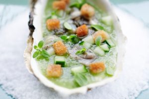 Votre marché pour 6 personnes : 2 concombres ; 18 huîtres plates n°3 ; une demi botte de marjolaine fraîche ; 1 botte d’oignons nouveaux ; 25 cl de bouillon de...