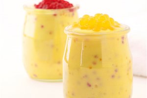 Votre marché pour 4 personnes : 4 yaourts nature au lait entier ; 80 g de perles du Japon ; 5 cl de sirop de citron ; 5 cl de sirop de grenadine ; 2 gels...