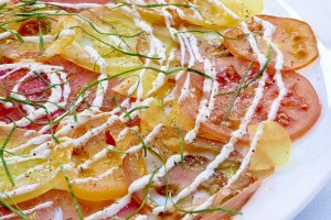 Préparation : 15 min – Pas de cuisson Votre marché pour 4 personnes : 5 belles tomates de couleurs différentes bien mûres ; 2 cuillères à soupe de crème...