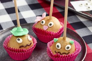 Votre marché pour 6 cakes pops : 1 boîte de 55 g de crème dessert Mont-Blanc parfum praliné ; 50 g de beurre ; 20 g de sucre cassonade ; 8 g de levure ;...