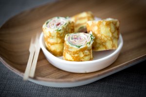 Préparation : 10 min Votre marché pour 4 personnes : 4 belles crêpes de froment ; 4 tranches de jambon blanc ; 1 fromage frais tartinable (type St Môret) ; 2...
