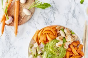 Préparation : 15 min / Cuisson frites : 20 min et autres légumes : 10 min / Cuisson lapin : 5 min Votre marché pour 2 personnes : 4 filets de lapin Légumes : 1...