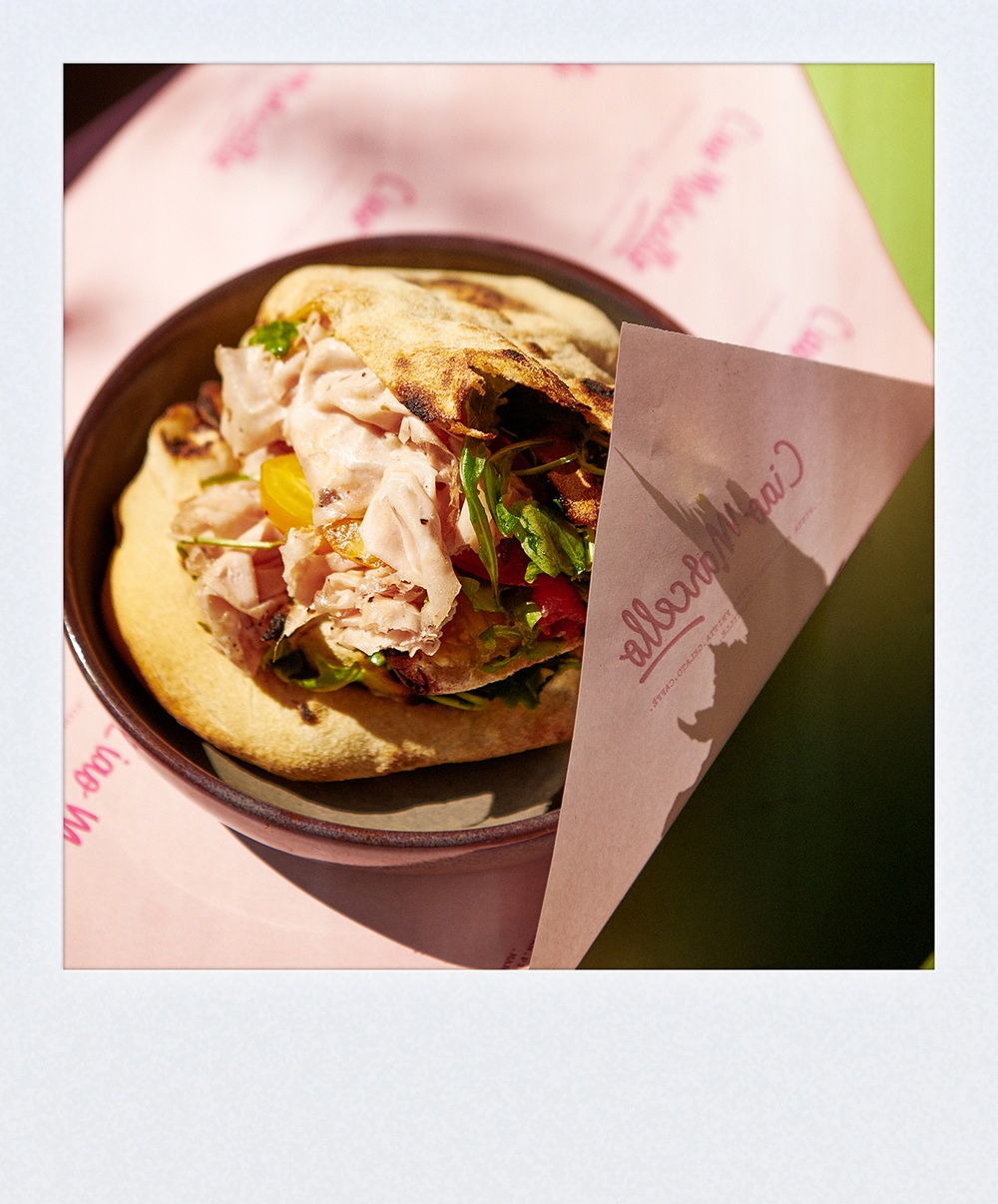 Panizza (10 €) : pâte à pizza façon baguette, jambon (blanc/cru) ou mortadelle, fromage (parmesan/mozzarella fleur de lait/ricotta citron confit).« J’ai dans le sang le produit que je cuisine : son sourcing, sa dimension, sa tradition. Mes fournisseurs italiens sont inédits et ensuite à moi de jouer le jeu : saumure, assaisonnement, protocoles de cuisinier. Chaque geste compte pour que le goût soit honoré ». (Arnaud)