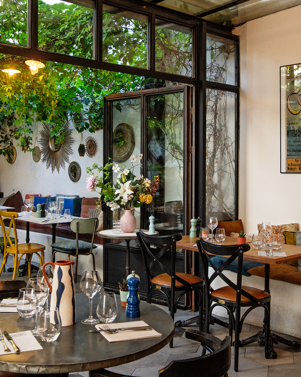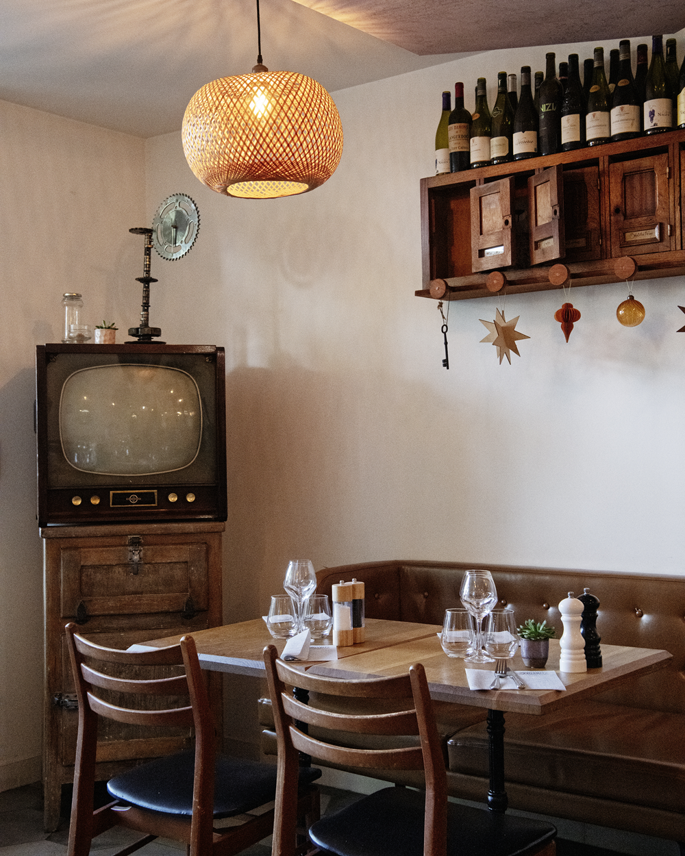 À l’intérieur, l’ambiance est brute mais délicate, entre tables en bois non nappées, chaises dépareillées, objets patinés et douce lumière filtrée. Loin du folklore, ici tout est sincère, pensé pour que chacun et chacune s’y sente bien, comme chez des ami·es qui savent recevoir.