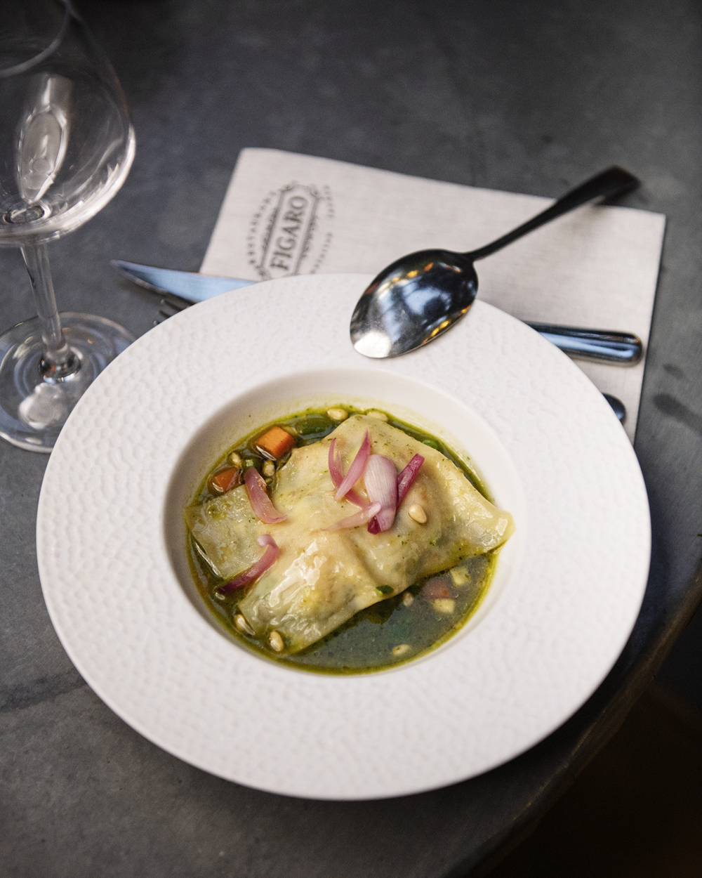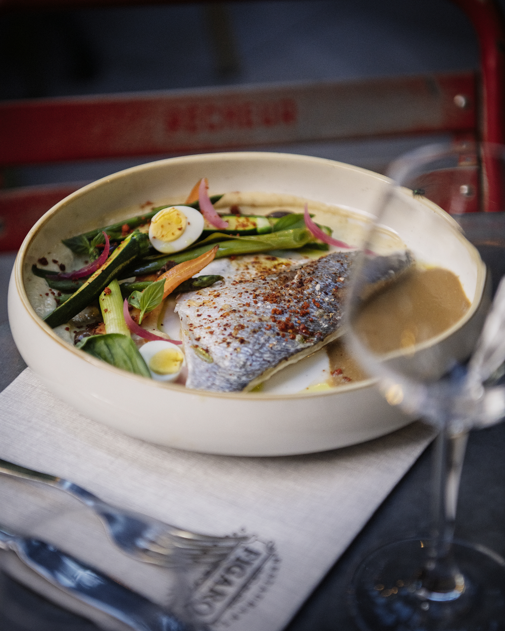Côté cuisine, Figaro joue la partition bistrotière avec générosité. Une cuisine française revisitée, de saison, inventive et sans chichi. Tous les quinze jours, la carte change, mais l’envie reste : surprendre sans perdre le goût du vrai. Œuf parfait décliné au fil des idées, carbonara de seiche, vol-au-vent gambas-coco-combava, pluma de porc et sucrine braisée… Les classiques sont malicieusement bousculés.