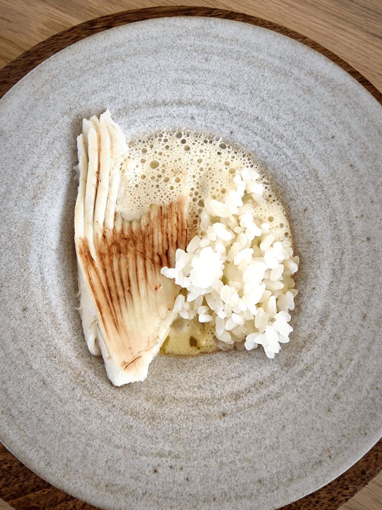 De Pietravalle on retiendra l’envie de nous raconter sa Provence, celle d’un pistou de feuilles de figue-lisette marinée et figue au vinaigre. Le poisson, l’arbre, une étonnante fraîcheur derrière la simplicité apparente d’une belle composition équilibrée et délicate. Une réconfortante anchoïade aux légumes du jardin et mesclun s’acoquine d’un ragoût de cochon. Un ensemble végétal, jamais brutal, avec beaucoup d’ampleur et de relief. De la langoustine juste pochée-grillée en mijotée de pieds-paquets, on aime le bouillon d’anguille qui apporte le gras et de l’élégance. Un subtil amer (confit de pamplemousse) titille une aile de raie cuite en bagna cauda. Ultime service d’un déjeuner sang et or, le pissalat aux herbes de la colline nappe une caillette d’agneau braisée dans un chou. L’agneau et le gras, dans sa plus simple et glorieuse expression : les dés sont jetés.