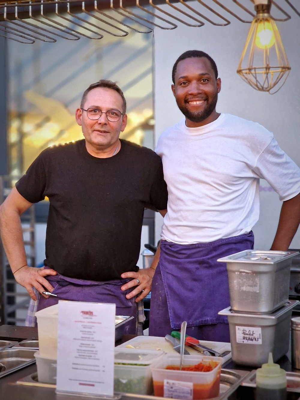 Tu te balades, tu lis une carte et tu te dis que ce serait sympa de grailler ici, sur le Vieux-Port, au soleil couchant. La terrasse est dressée sur le parvis de la Criée, avec une mini cuisine éclairée d’une guirlande esprit guinguette ; la carte est signée Laurent et Axel. Laurent Mercier, c’est le chef résident des Grandes Tables de la Criée, le restaurant du théâtre. Axel Mbetcha Tiezan, est un cuisinier qui travaille à l’organisation de festivals reconnus tels que les Rencontres des Cuisines d’Afrique ou Kouss Kouss. Alléchant programme. L’ardoise mixe deux pays, deux univers, deux cuisines, de la France au Congo.