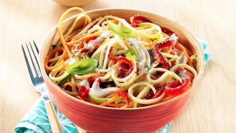 Préparation : 10 min / Cuisson : 45 min Votre marché pour 4 personnes : pour les spaghetti de légumes, 150 g de carottes ; 250 g de courgettes ; 250...