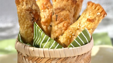 Préparation : 10 min / Cuisson : 15/20 min Votre marché pour 8 feuilletés : 1 pâte feuilletée au beurre prête à l’emploi ; 80 g de fromage Pont...