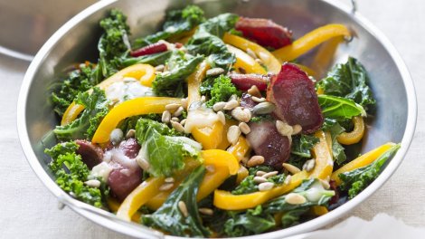 Préparation : 10 min / Cuisson : 10 min Votre marché pour 4 personnes : un tiers de reblochon ; 6 grandes feuilles de chou kale ; 1 poivron jaune ;...