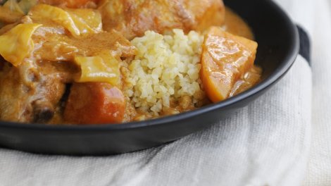 Votre marché pour 4 personnes : 1 poulet fermier ; 500 ml de crème fleurette ; 400 g de beurre de cacahuètes ; 1 gros oignon ; 4 carottes ; 3 tomates...