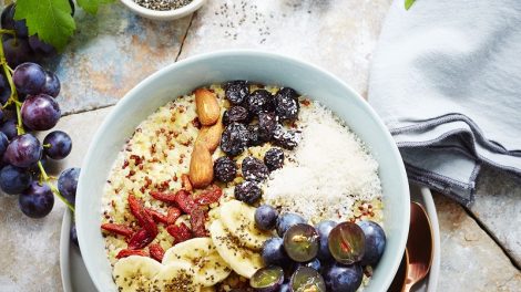 Votre marché pour 1 personne : 50 g de quinoa (au choix 3 couleurs) ; 25 cl de lait végétal (soja, coco, amande, etc.) ; 1 cuillère à soupe de crème...