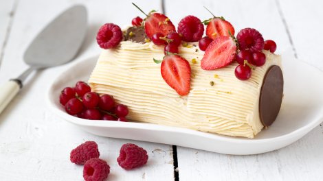 Préparation : 2 h 30 min / Cuisson : 30 min Votre marché pour 4 personnes : pour la génoise, 3 blancs d’œufs ; 75 g de sucre ; 75 g de farine...
