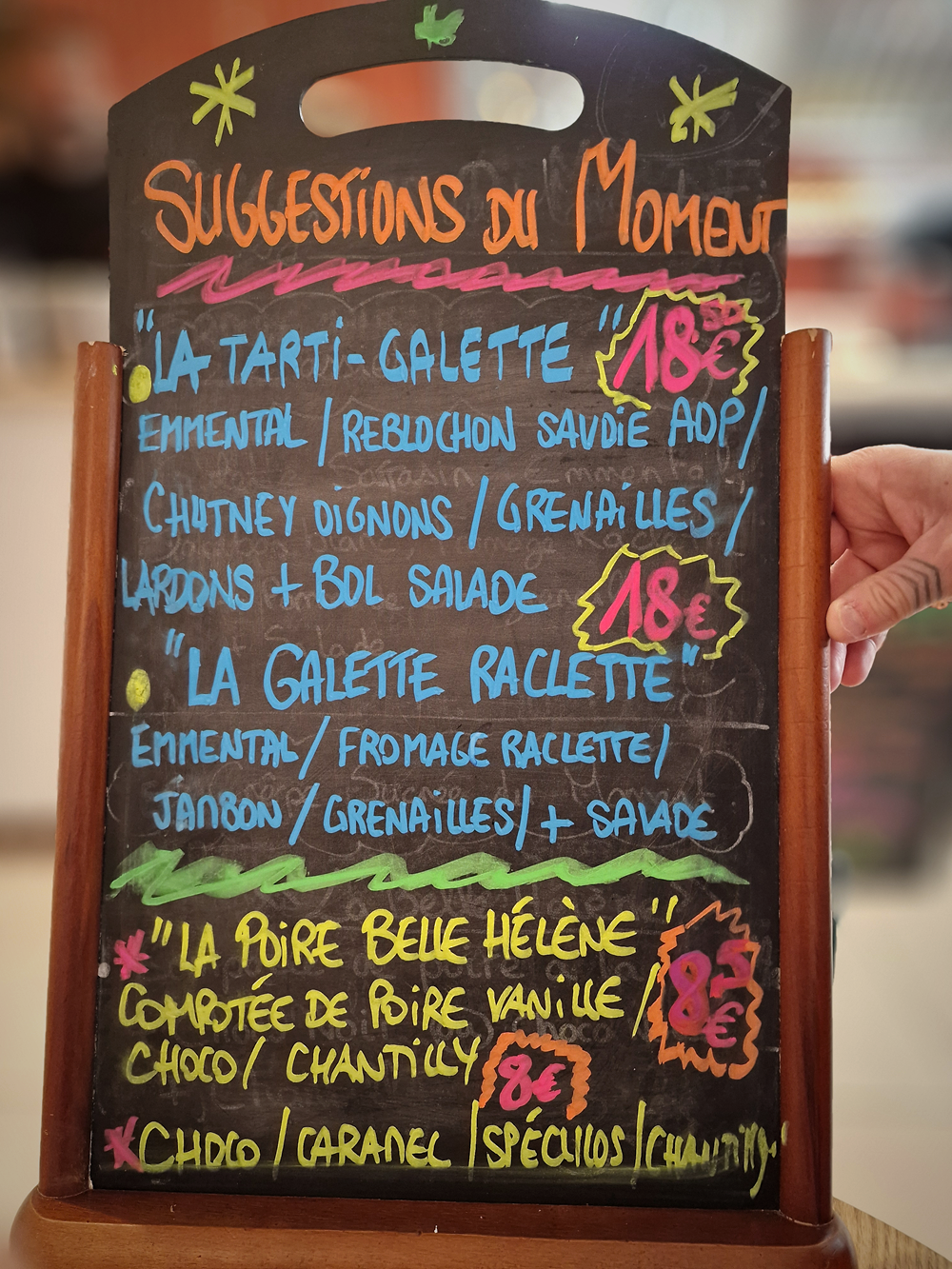Trop long et fastidieux de résumer la classique carte des crêpes et galettes (œuf-jambon-fromage, légumes de saison-olives noires, emmental-confit d’oignon et saucisse de Marseille). Une ardoise d’inspirations du moment vient compléter une offre joyeuse à coups de poires compotées, de reblochon fondu ou de fromage à raclette. Côté desserts, de la citron-sucre au caramel beurre salé, de la miel-noix à la choco-choco, vous y trouverez votre bonheur.