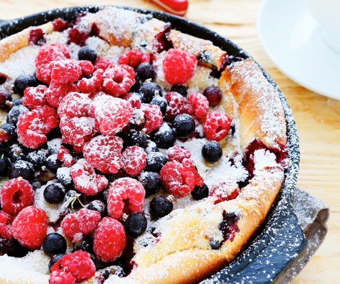 Votre marché pour 6 personnes : 150 g de myrtilles ; 150 g de framboises ; 10 g de beurre ; 1 sachet de sucre vanillé ; 1 gousse de vanille ; 15 g de farine ; 15 g de poudre d’amandes ; 2 œufs fermier bio (de poules élevées en liberté) et 20 cl de lait. On y va : faites chauffer à feu doux le lait...