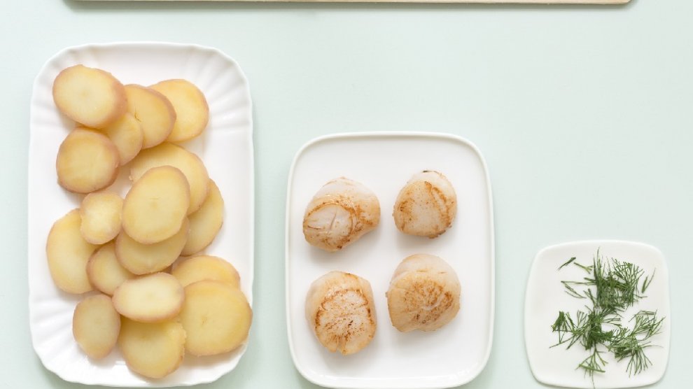 Votre marché pour 4 personnes : 800 g d’emmental ; 12 belles noix de saint-jacques sans corail ; 1 botte d’aneth ; 1 botte d’oignons grelots ; 30 g de beurre ; 50 g de sucre ; 600 g de pommes de terre Roseval ; 1 cuillère à soupe de baies roses et 2 citrons jaunes. On y va : faites cuire les pommes...