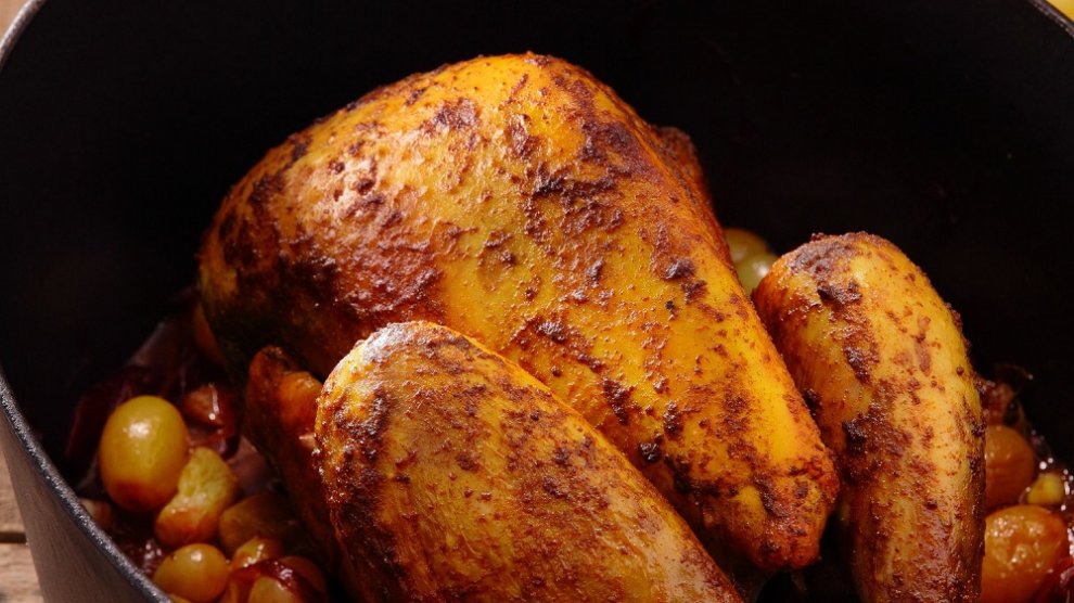 Préparation : 30 min / Cuisson : 1h10 Votre marché pour 6 personnes : 1 pintade fermière Label Rouge (environ 1,4 kg) ; 3 cuillères à soupe d’huile d’olive ; 1 oignon rouge ; 1 tête d’ail pelée et dégermée ; 100 ml de jus de raisin et 100 ml de vin muté (type pineau des Charentes) ; 2 grappes de...