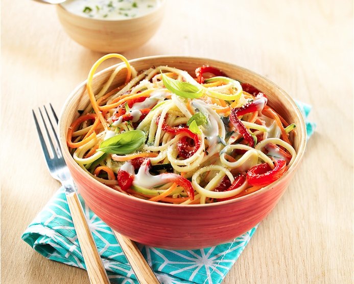 Préparation : 10 min / Cuisson : 45 min Votre marché pour 4 personnes : pour les spaghetti de légumes, 150 g de carottes ; 250 g de courgettes ; 250 g de poivron rouge. Pour le crème au chèvre frais : 50 g de lait en poudre Régilait ; 150 ml d’eau ; 70 g de fromage de chèvre frais ; 6 grosses...
