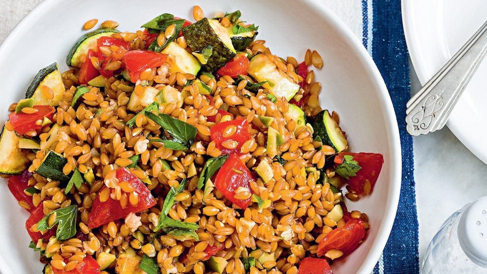 Votre marché pour 4 personnes : 200 g d’épeautre ; 1 courgette ; 2 tomates ; 40 g d’olives vertes de variété lucques ; 2 branches de persil plat ; 1 filet d’huile d’olive des Alpes de Haute-Provence ; sel et poivre du moulin. On y va : faire tremper les grains d’épeautre dans 2 fois leur volume...