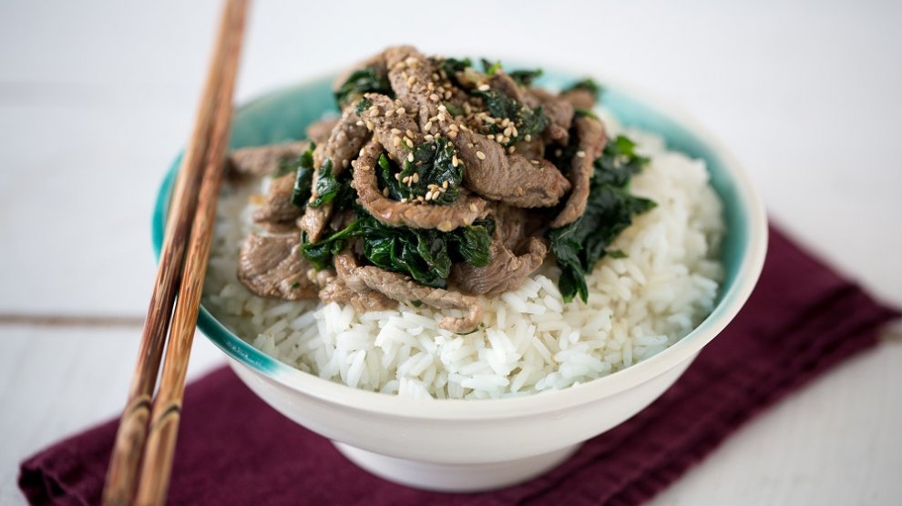 Préparation : 20 min / Cuisson : 10 min Votre marché pour 4 personnes : 500 g de filet de boeuf (ou coeur de rumsteack) ; 500 g d’épinards frais ; 2 oignons ; 50 g de beurre. Marinade : 1 cuil. à café de piment doux ; 2 cuil. à café de gingembre frais ; 1 gousse d’ail ; 2 cuil. à soupe...