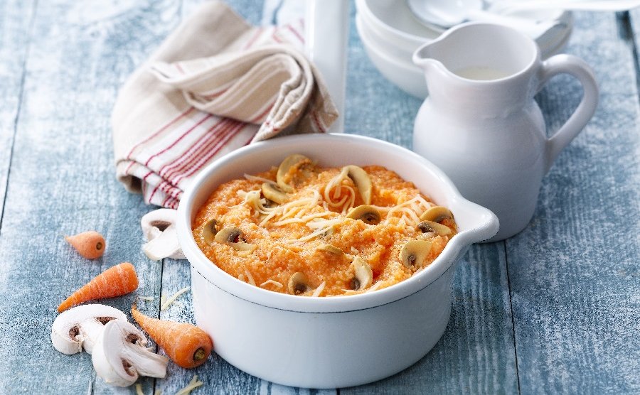Préparation : 10 min / Cuisson : 5 min Votre marché pour 2 personnes : 7 cuillères à soupe de Floraline ; 400 g de champignons émincés ; 3 petits oignons ; 4 carottes ; 75 g d’emmental râpé ; 500 ml de lait + un peu de lait pour délayer la purée ; de l’huile d’olive ; gros sel et poivre du...