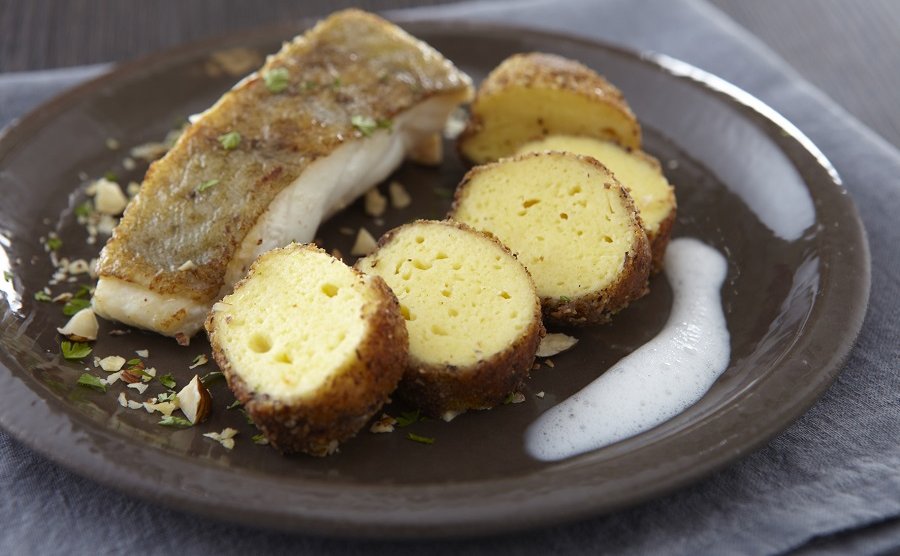 Préparation : 20 min / Cuisson : 25 min / Repos : 15 min Votre marché pour 4 personnes : 6 quenelles nature ; 2 blancs d’œuf ; 100 g de chapelure ; 150 g de poudre de noisette ; 50 g de beurre ; 4 pavés de cabillaud ; 20 cl de lait ; 100 g de lard fumé ; 3 cl d’huile d’olive ; 2 branches de...