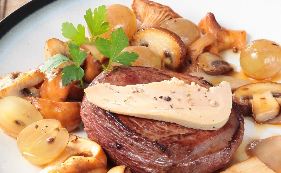 Préparation : 20 min / Cuisson : 15 min Votre marché pour 4 personnes : 2 magrets de canard ; 100 g de foie gras mi-cuit ; 150 g de girolles ; 150 g de champignons de Paris ; 150 g de pleurotes ; une grappe de raisin blanc ; 20 g de beurre ; 2 cuillères à soupe d’huile d’olive ; de la fleur de sel...