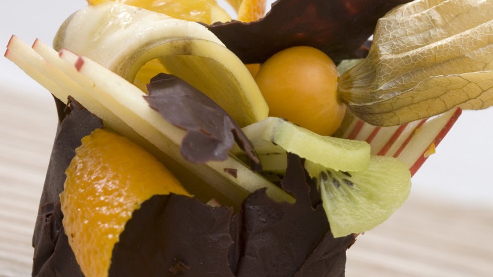 Préparation : 30 min / Cuisson : 5 min Votre marché pour 6 personnes : 200 g de chocolat noir ; 2 cl d’huile de noisette ; 10 cl de lait entier. Pour les fruits : 3 pommes Ariane ; 30 g de sucre semoule ; 200 g de raisin noir ; 12 physalis. On y va : coupez une feuille de papier sulfurisé en carrés...