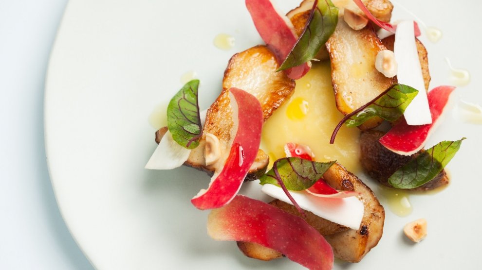 Votre marché pour 4 personnes : 4 pommes Pink Lady ; 8 cèpes ; quelques noisettes ; 105g de beurre demi-sel ; 1 cuillère à café de sucre ; quelques feuilles d’oseille ; de l’huile d’arachide ; de la fleur de sel de Camargue et le jus d’un citron jaune. On y va : éplucher les pommes Pink...
