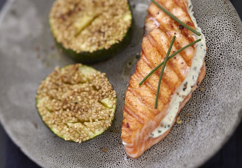 Préparation : 30 min / Cuisson : 25 min Votre marché pour 4 personnes : 4 pavés de saumon écossais Label Rouge sans peau de 160 g environ ; 150 g de fromage frais ; 1 botte de ciboulette ; 10 cl d’huile d’olive ; 40 g de graines de sésame ; 4 courgettes rondes ; sel et poivre du moulin...