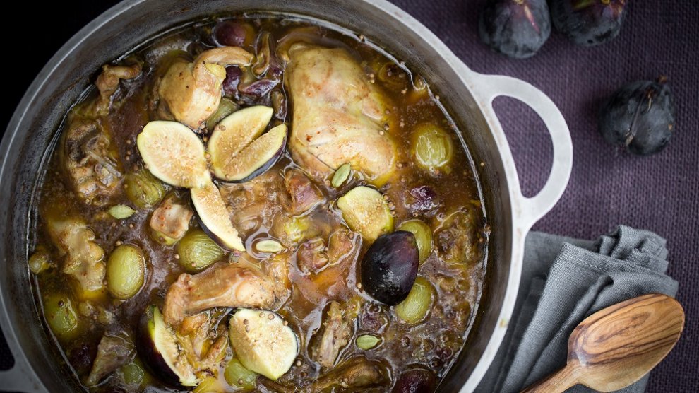 Préparation : 10 min / Cuisson : 45 min Votre marché pour 4 personnes : 4 échalotes ; 1 petite grappe de raisin rouge ; 1 petite grappe de raisin blanc ; 60 g de beurre demi-sel ; 2 râbles et 2 cuisses de lapin ; 2 cuil. à soupe de miel ; une demi cuil. à café de curcuma ; 2 pincées de girofle en...
