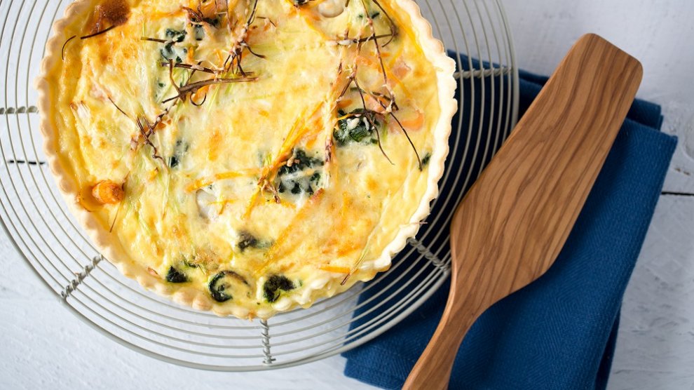 Votre marché pour 6 personnes : 200 g d’épinards ; 1 carotte ; 1 blanc de poireau ; 40 g de beurre demi-sel ; 1 rouleau de pâte brisée ; 12 crevettes roses ; 1 tranche de saumon fumé ; 3 oeufs ; 8 cl de lait entier ; 5 cl de fumet de poisson ; 8 cl de crème liquide à 30% de matières grasses...