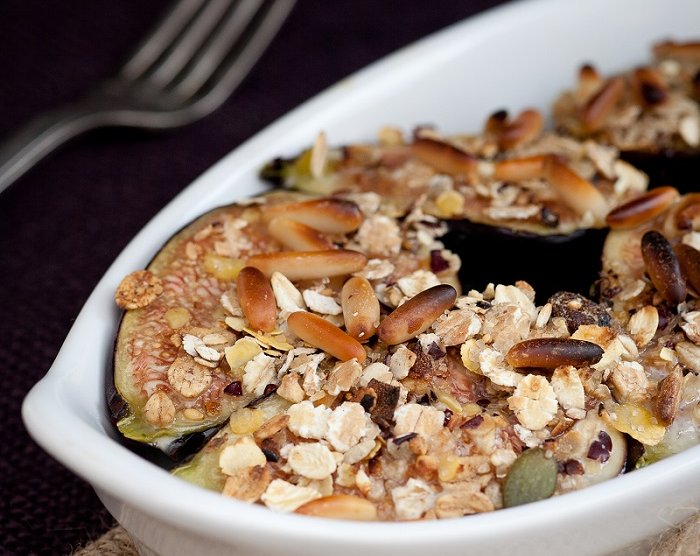 Préparation : 15 min / Cuisson : 8 min Votre marché pour 4 personnes : 12 figues bien mûres ; 50 g de muesli non sucré ; 20 g de pignons de pin ; 20 cl de crème liquide entière ; 2 cuil. à soupe de sucre roux et 10 g de beurre demi-sel. On y va : préchauffer le four à 180°C (th.6). Laver et sécher...