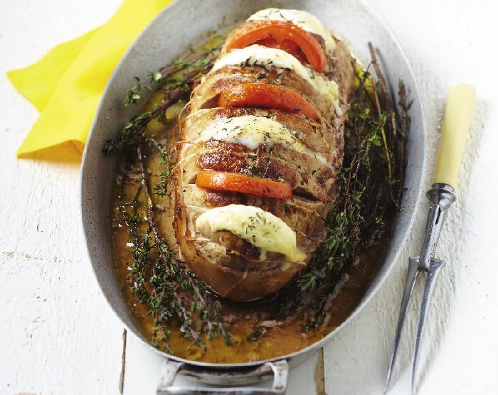 Préparation : 15 min / Cuisson : 45 min Votre marché pour 4 personnes : 1 rôti de veau de 800 g à 1 kg ; 2 crottins de Chavignol ou des chèvres de Provence affinés ; 2 tomates ; 2 branches de thym ; 2 cuillères à soupe d’huile d’olive ; sel et poivre. On y va : préchauffer le four à 170°C (Th. à...