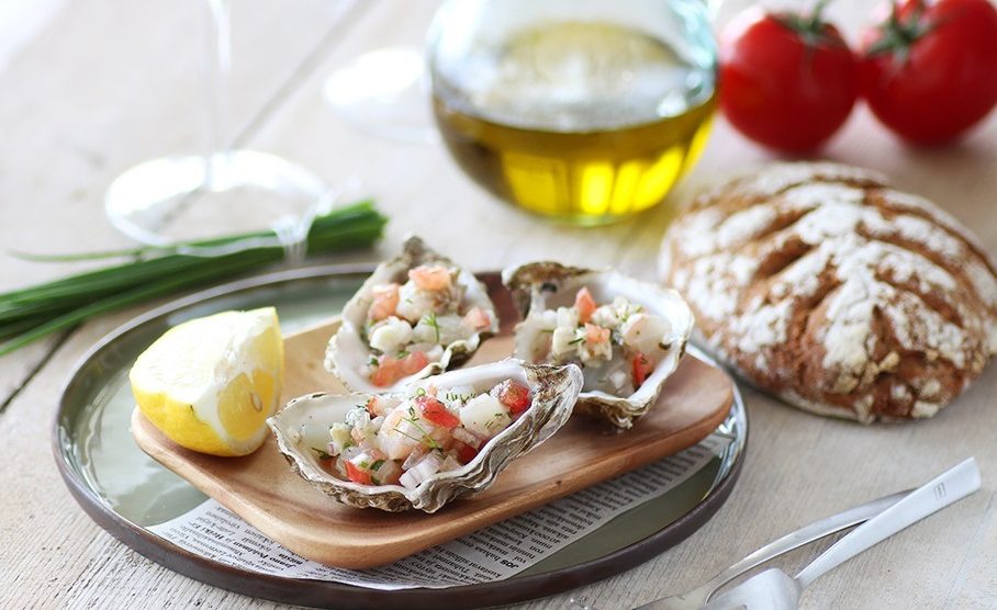 Votre marché pour 4 personnes : une douzaine d’huîtres ; 350 g de filet de bar (le loup en Provence) ; 2 cuillères à soupe d’huile d’olive ; 1 cuillère à soupe de jus de citron ; 2 branches d’aneth ; 1 tomate et quelques baies roses ; 1 échalote, du sel et du poivre. On y va...