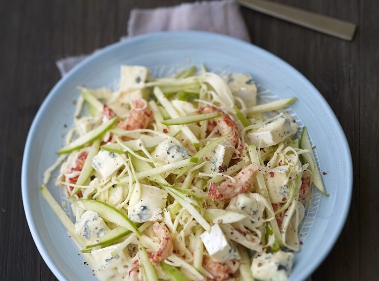 Préparation : 15 min / Réfrigération : 1 heure Votre marché pour 4 personnes : 250 g de fromage bleu type Bresse Bleu (ou Fourme d’Ambert) ; 400 g de chou blanc ; 2 pommes vertes type Granny ; 200 g de queues d’écrevisses ; 2 cuillères à soupe bombées de mayonnaise ; sel et poivre du...