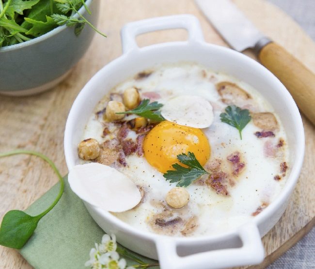 Votre marché pour 4 personnes : 4 gros oeufs bio Lustucru ; 60 g de lardons fumés ; 3 gros champignons de Paris (ou tout autre champignon) ; 30 g de noisettes entières torréfiées ; quelques feuilles de persil plat ; du beurre frais ; de l’huile de noisette ; de la fleur de sel et du poivre...