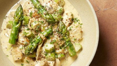 veau aux asperges Votre marché pour 4 personnes : 600 g d’escalopes de veau ; 8 asperges vertes ; 8 champignons de Paris ; 1 oignon ou 1 échalote ; ...