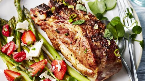échine de porc bio Votre marché pour 4 personnes : 1,2 kg d’échine de porc bio ; 2 bottes d’asperges vertes ; 250 g de fruits rouges (fraises...