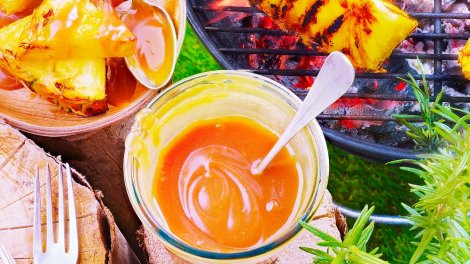 ananas grillé Votre marché pour 6 personnes : 1 gros ananas ; 30 g de sucre en poudre Sauce crémeuse caramélisée : 160 g de sucre ; 100 g de beurre...