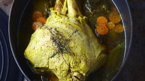 bouillon safrané Votre marché pour 6 à 8 personnes : 1 gigot d’agneau entier ; 4 carottes ; 1 gros oignon ; 4 branches de thym frais ; 2 feuilles de...