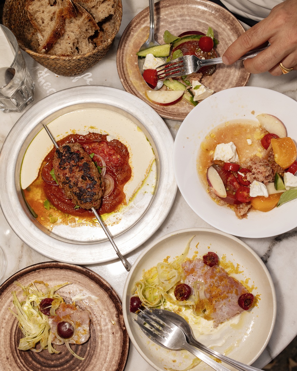 Séduits par le quartier Longchamp, les deux associés ont aimé la terrasse et les aménagements intérieurs de ce local qui n’attendait qu’eux. « Les gens du quartier et l’ancien propriétaire nous ont poussés à servir une cuisine exigeante », se souvient Franck. C’est alors qu’ils rencontrent Johann Barichasse, un chef autodidacte d’origine marocaine, second de Manon Fleury à Paris, passé par les Grandes Tables de la Criée. « Dans un style ‘cuisine et origines’, il excelle dans le registre judéo-marocain. Il sert une cuisine de rue et puise son inspiration bistronomique dans les recettes ‘de là-bas’ jusqu’à visiter tous les rivages de la Méditerranée », résume Antoine. Pour accompagner un crudo de thon germon, fenouil, boutargue et cerises, une superbe kefta de bœuf et d’agneau, tomate grattée, harissa et toum, on choisira des vins bio, biodynamiques, « des vins dans le respect du vivant, soignés de la vigne jusqu’à la cave », explique Franck. Les quilles de Sylvain Morey, de Jonathan Pabiot, de Myrko Tepus et autre Jean-Benoît Comor suffiront à convaincre. Chaque soir, de la salle à la terrasse, on entend tinter les verres et cliqueter les couverts, Franck et Antoine sont rassurés, un an et demi plus tard, l’enthousiasme reste intact.