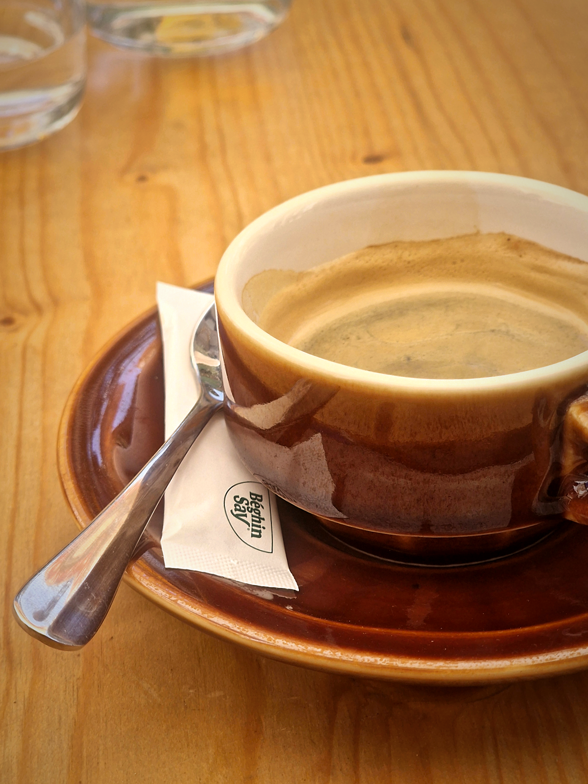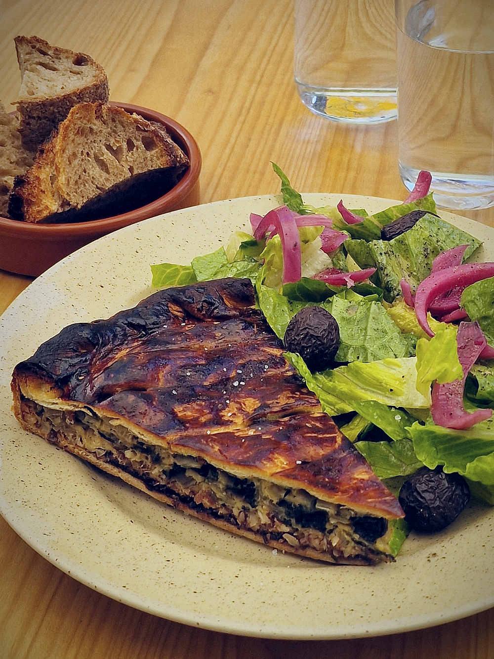 Le déjeuner au soleil, sous la bâche devant la vitrine peut débuter. Lou saussoun affiche la couleur d’un repas paysan : sur une sublime tartine de pain de campagne (Racines à Carnoux), des amandes écrasées (Francis Clary), feuilles de menthe et fenouil tempèrent l’agressivité saline des anchois. Frais et sain. La tourte de blettes provençale est assaisonnée au parmesan et pralin d’amandes. Le fonçage et le recouvrement de la pâte, gestes techniques s’il en est, sont parfaits, la cuisson, flirtant avec le brûlé enfonce le clou de la rusticité.