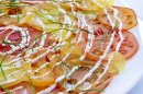 Carpaccio de tomates, crème fraîche aux quatre épices et oseille