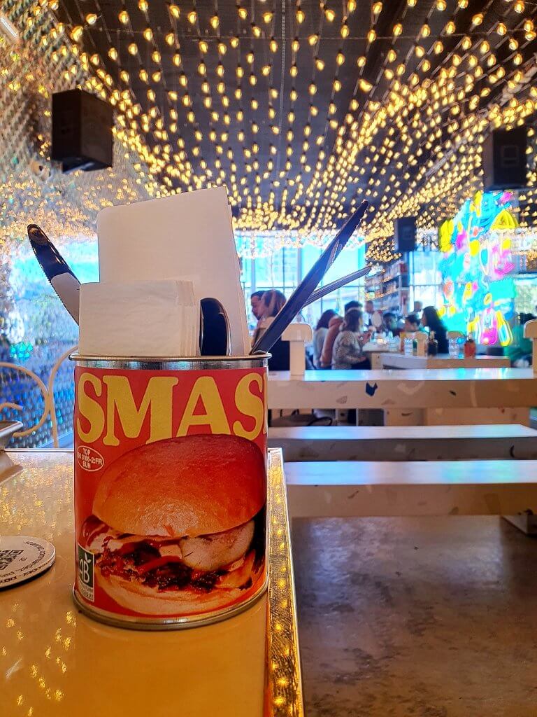 D’emblée, le décor revendiqué 80’s donne à sourire : guirlandes d’ampoules au plafond, CD collés aux murs en écailles et play-list aux airs de Snoop dogg (Who Am I – What’s My Name) campent l’ambiance. Au déjeuner, le personnel est très cool, souriant, accueillant et pédagogue avec une clientèle ultra majoritairement composée de millenials. Pas de carte mais un QR code à flasher. Sur l’écran du téléphone apparaît un menu interactif, on commande, on paie et quasi instantanément, un plateau est déposé à table avec le repas en mode grosse ou maxi dalle. Si votre smartphone a quelques années, il y a fort à parier que c’est un serveur qui viendra prendre la commande, toujours avec patience et sourire.
