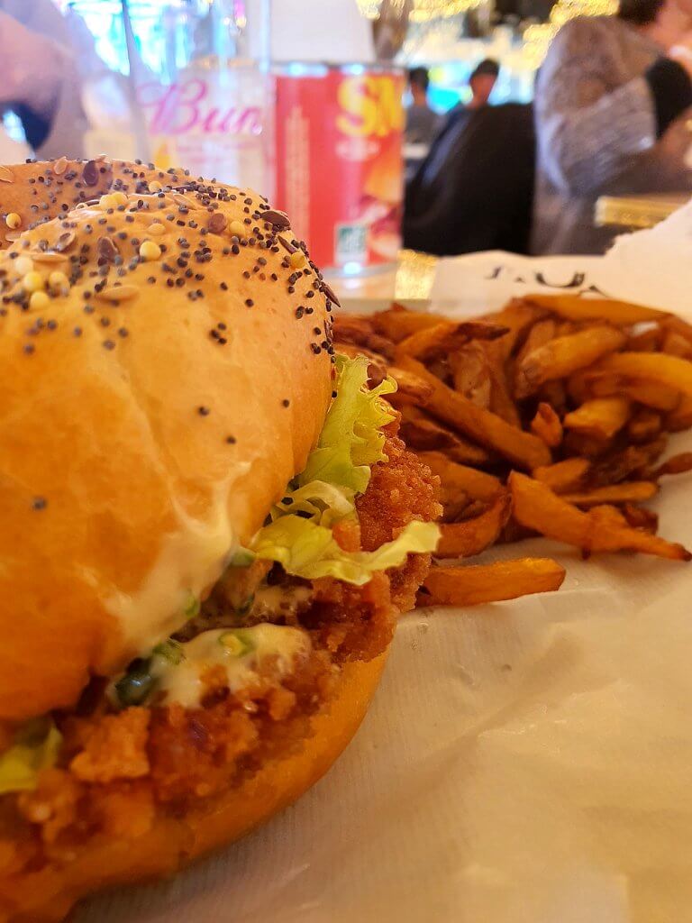 Ici, les burgers sont smashés, c’est-à-dire que la viande est écrasée à la presse, offrant une croûte caramélisée croustillante et juteuse à l’intérieur. Trois tailles de burgers et les origines France sont revendiquées. Pour le reste, que du classique avec des oignons, du ketchup, du cheddar, des pains bio réalisés sur place. Le chickenaton, clin d’œil au chanteur d’Iam, se pare de pickles dont l’acidité voisine avec la croustillace parfaite de la viance. Les frites, elles aussi fraîches, sont servies dans un sac en papier. Dommage, à la vapeur de cuisson ensachée, les pommes de terre perdent toute leur croustillance pour finir molles, spongieuses et graisseuses…